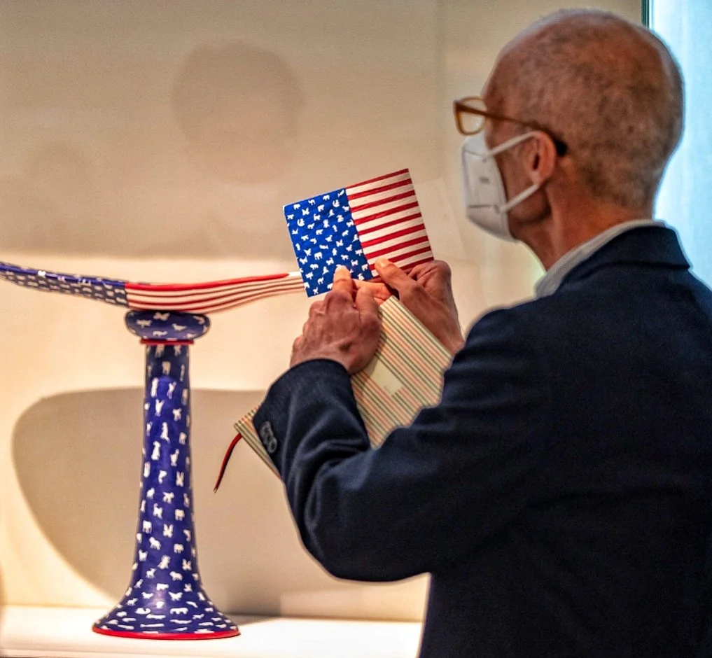 Note: Image is of William Warmus with artwork by Richard Marquis at the Press opening of “Venice and American Studio Glass” at the Stanze Del Vetro Museum in Venice in 2020, during the pandemic.